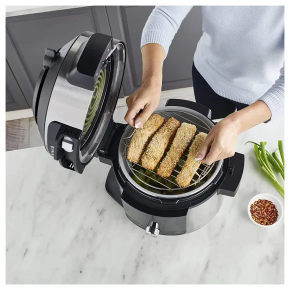 Dieser Multikocher der nächsten Generation bietet ein Fassungsvermögen von 7,5 Litern und eignet sich ideal zum schnellen Kochen, Dämpfen, Heißluftfrittieren, Grillen, Backen, Schmoren und vielem mehr. Er ist leicht zu reinigen und benötigt beim Frittieren bis zu 75 % weniger Öl.